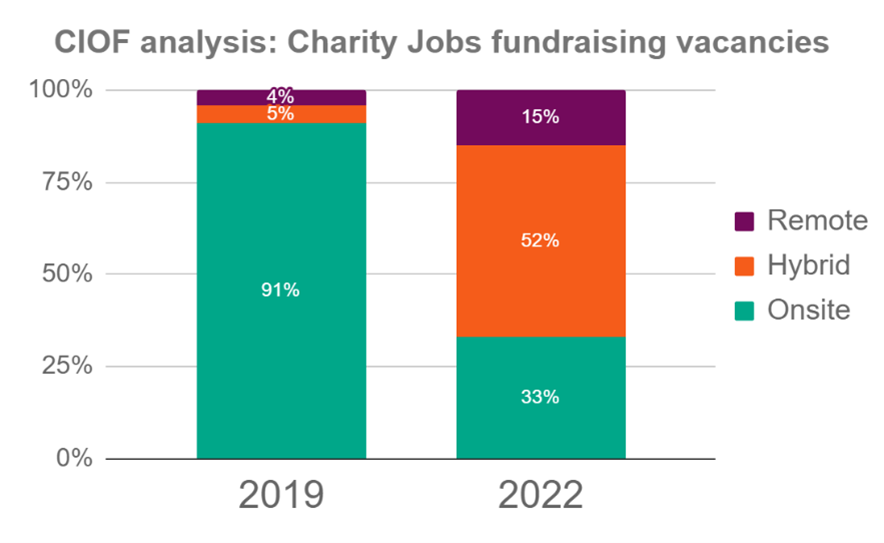 In April 2023, the Chartered Institute of Fundraising, working with Charity Jobs, produced some analysis on hybrid working within charity fundraising jobs. I’ve summarised their key finding in the graph below.